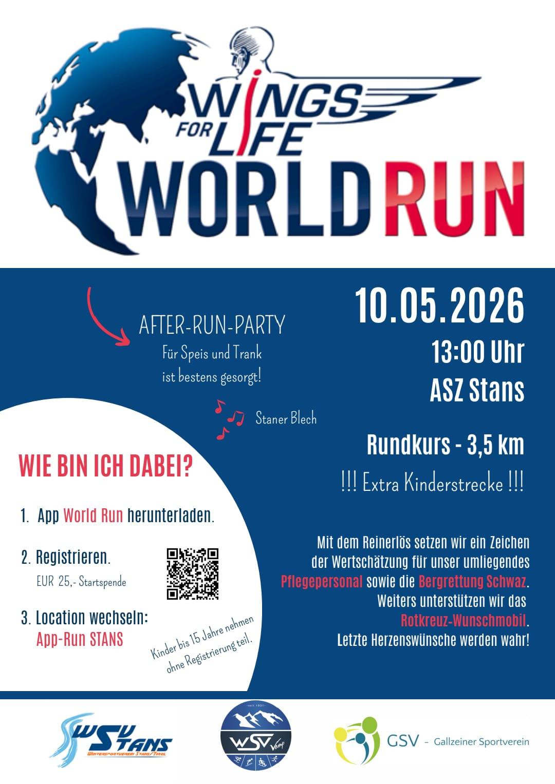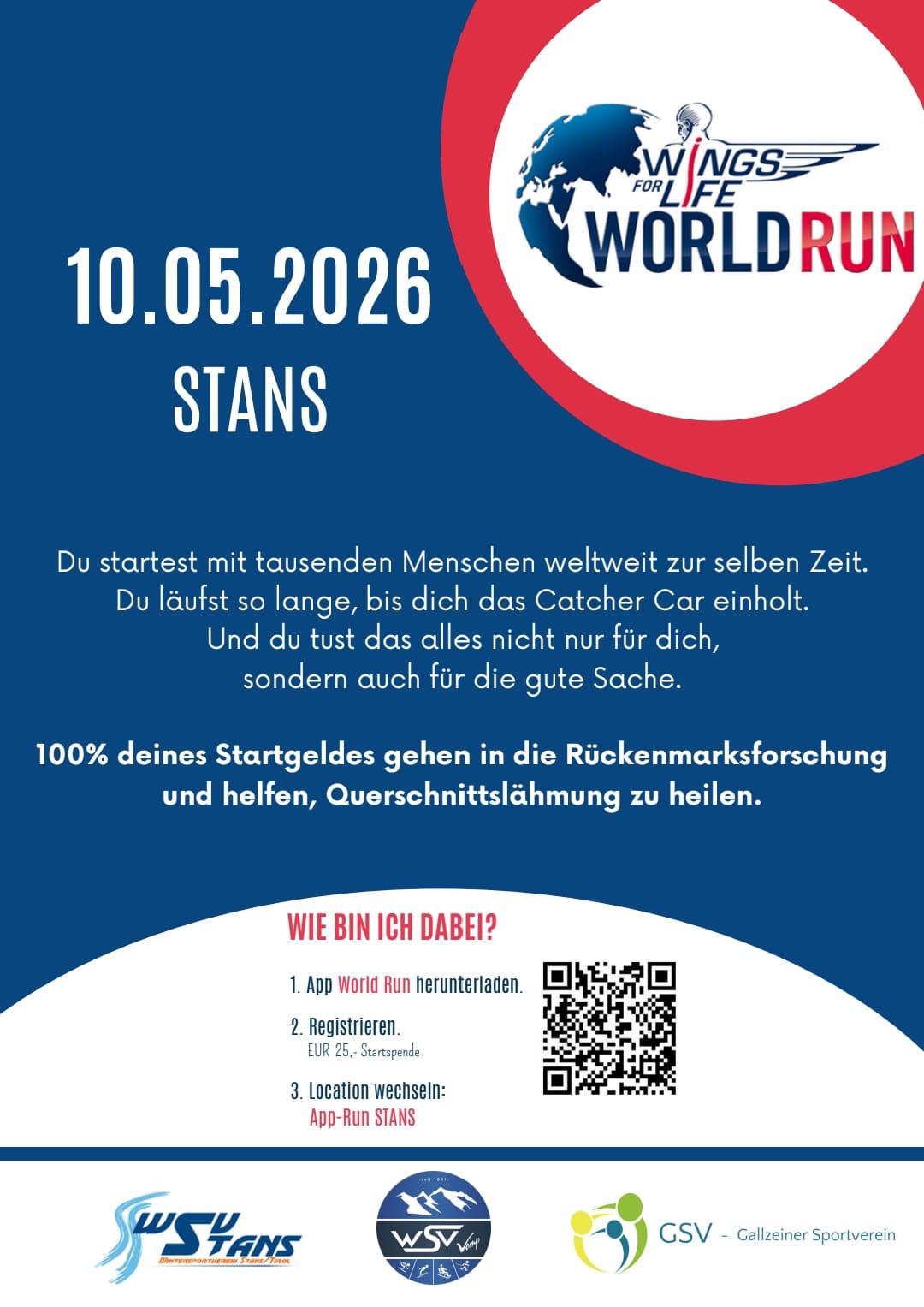 Neben dem Wings4Life App Run Stans 2026 zu Gunsten der Rückenmarkforschung, zu dem am Sonntag, 10. Mai 2026 um 13 Uhr beim ASZ Stans der Startschuss fällt, möchten die 3 Vereine wieder Geld sammeln. Geld zur Unterstützung regionaler Institutionen: Pflegekräfte aus der Umgebung, die Bergrettung Schwaz und das Rote Kreuz-Wunschmobil, das letzte Herzenswünsche wahr werden lässt.